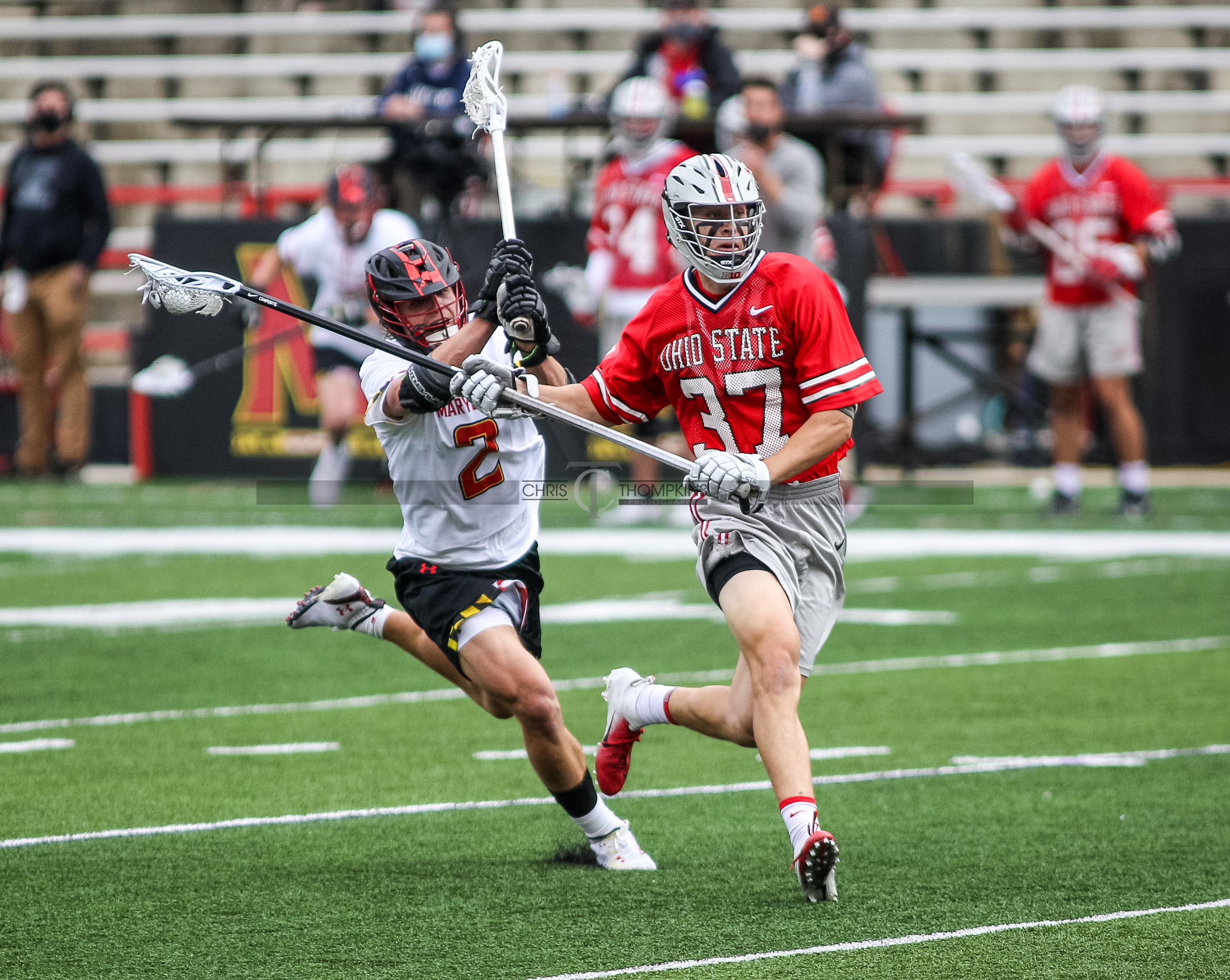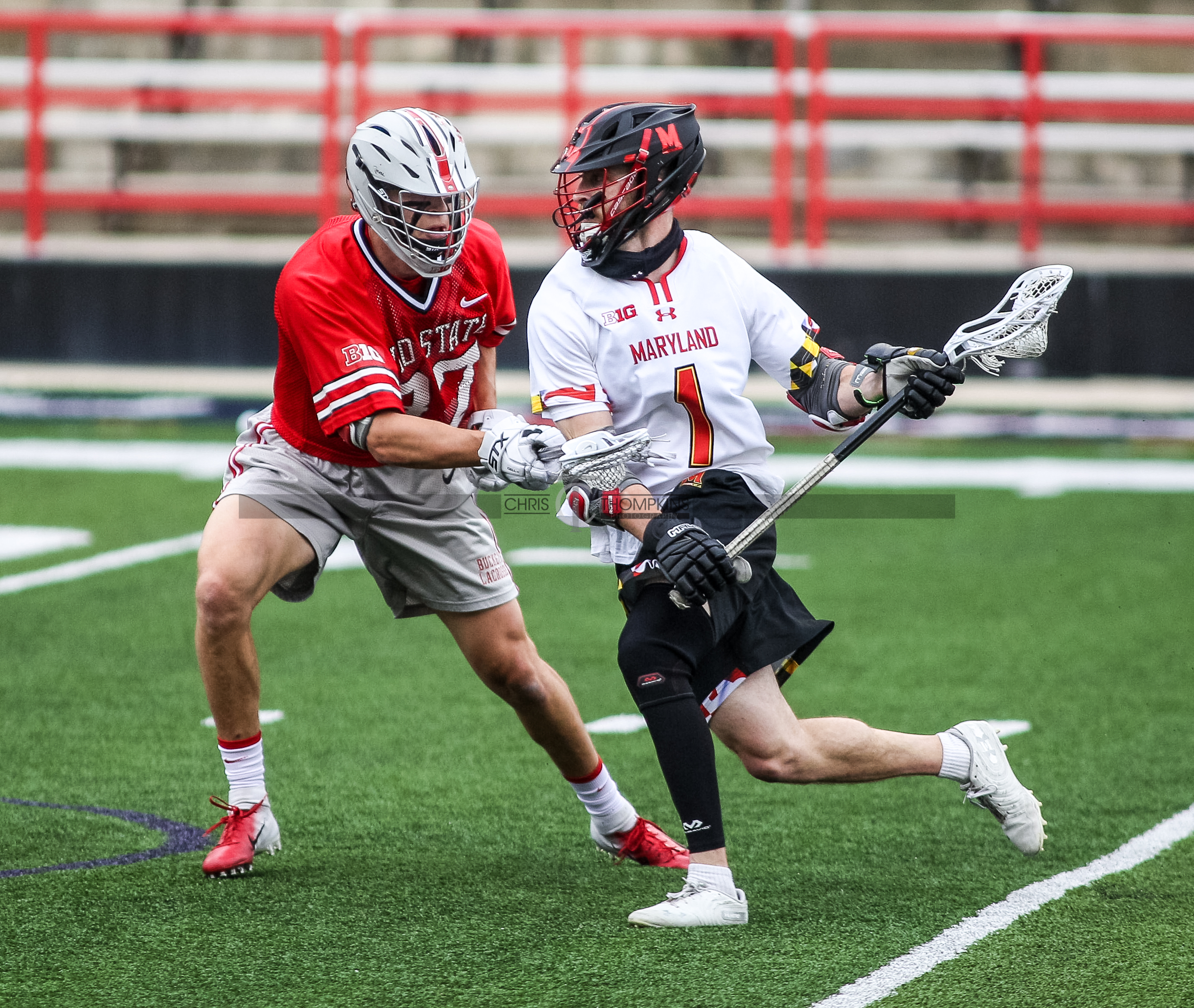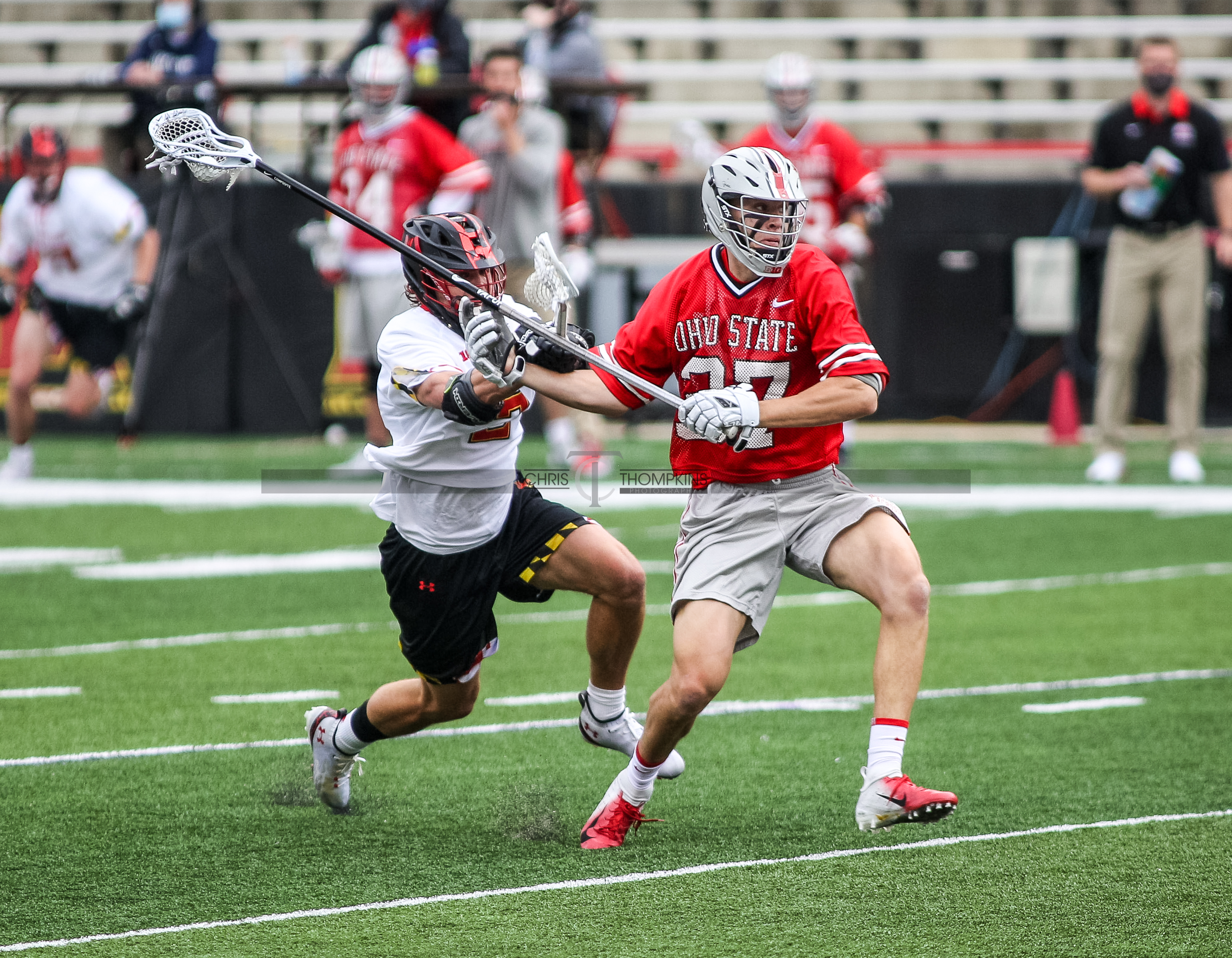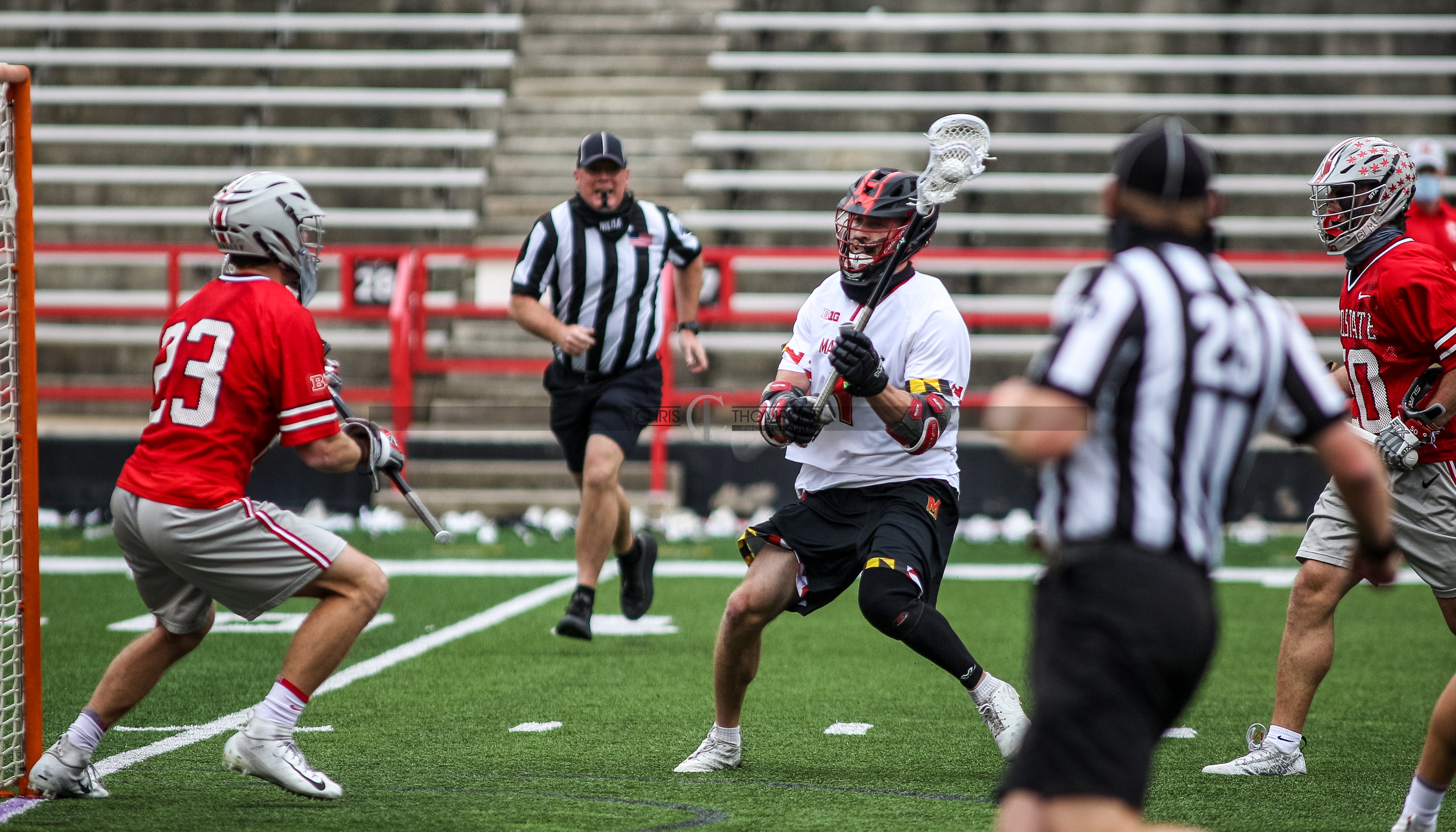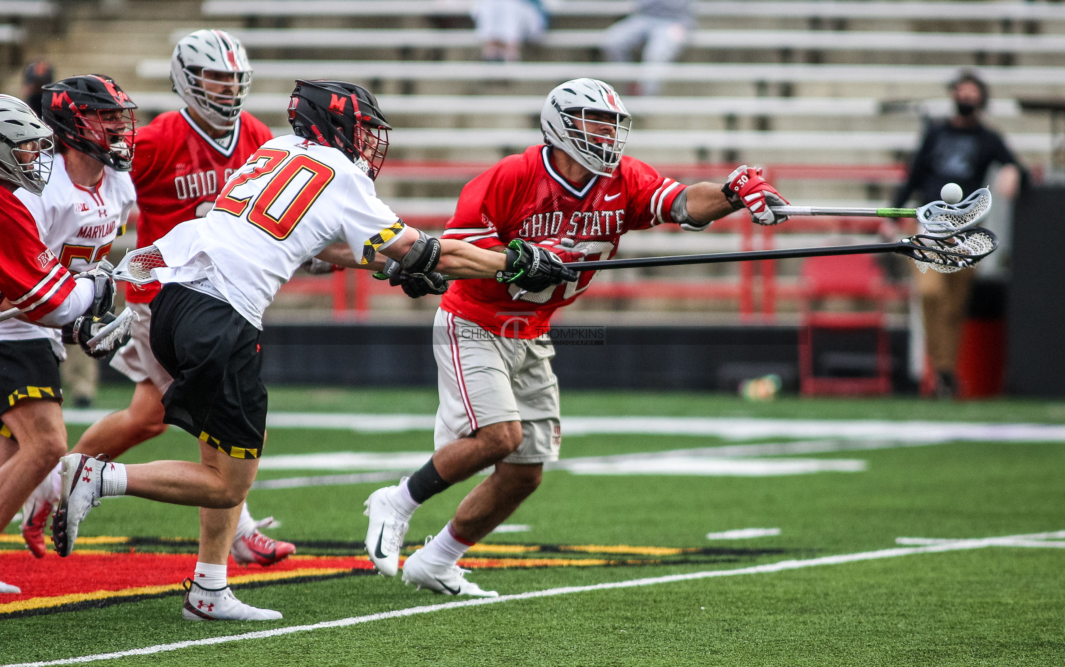 - April 18, 2021: Big Ten lacrosse action between Ohio State Buckeyes and Maryland Terrapins in College Park, Maryland. Photographer: Chris Thompkins (Credit Image: Chris Thompkins/dcsportsfan)