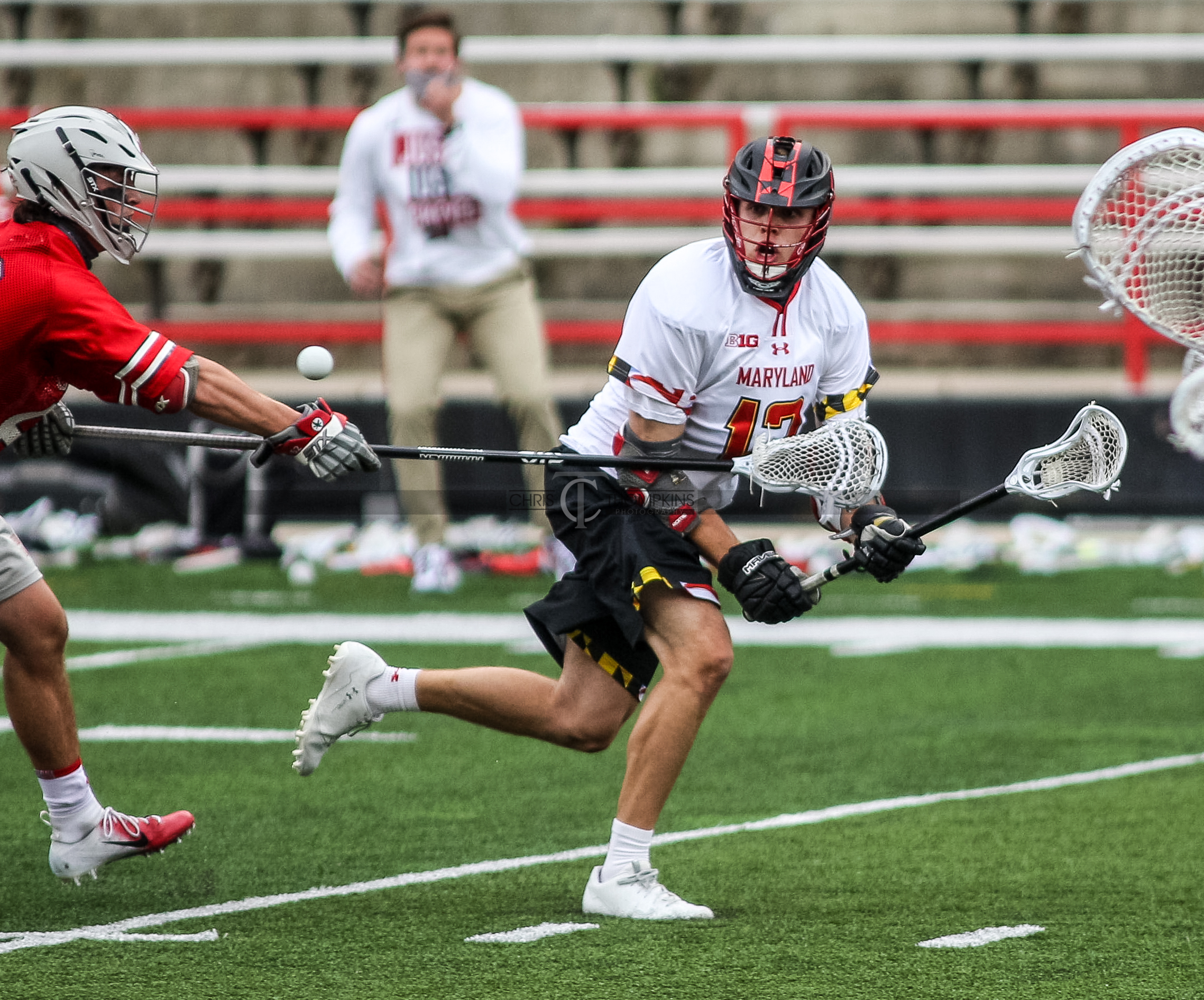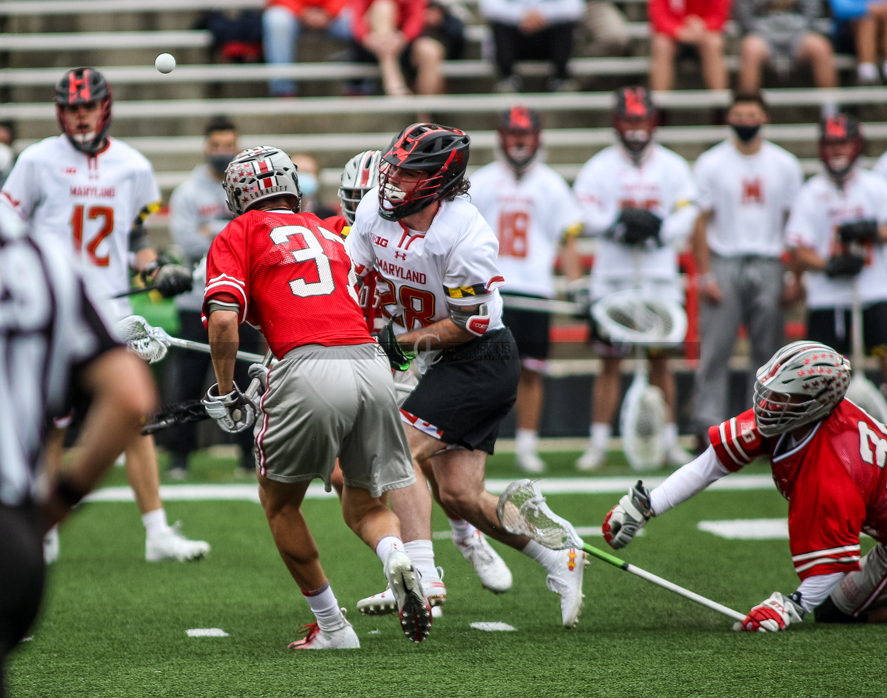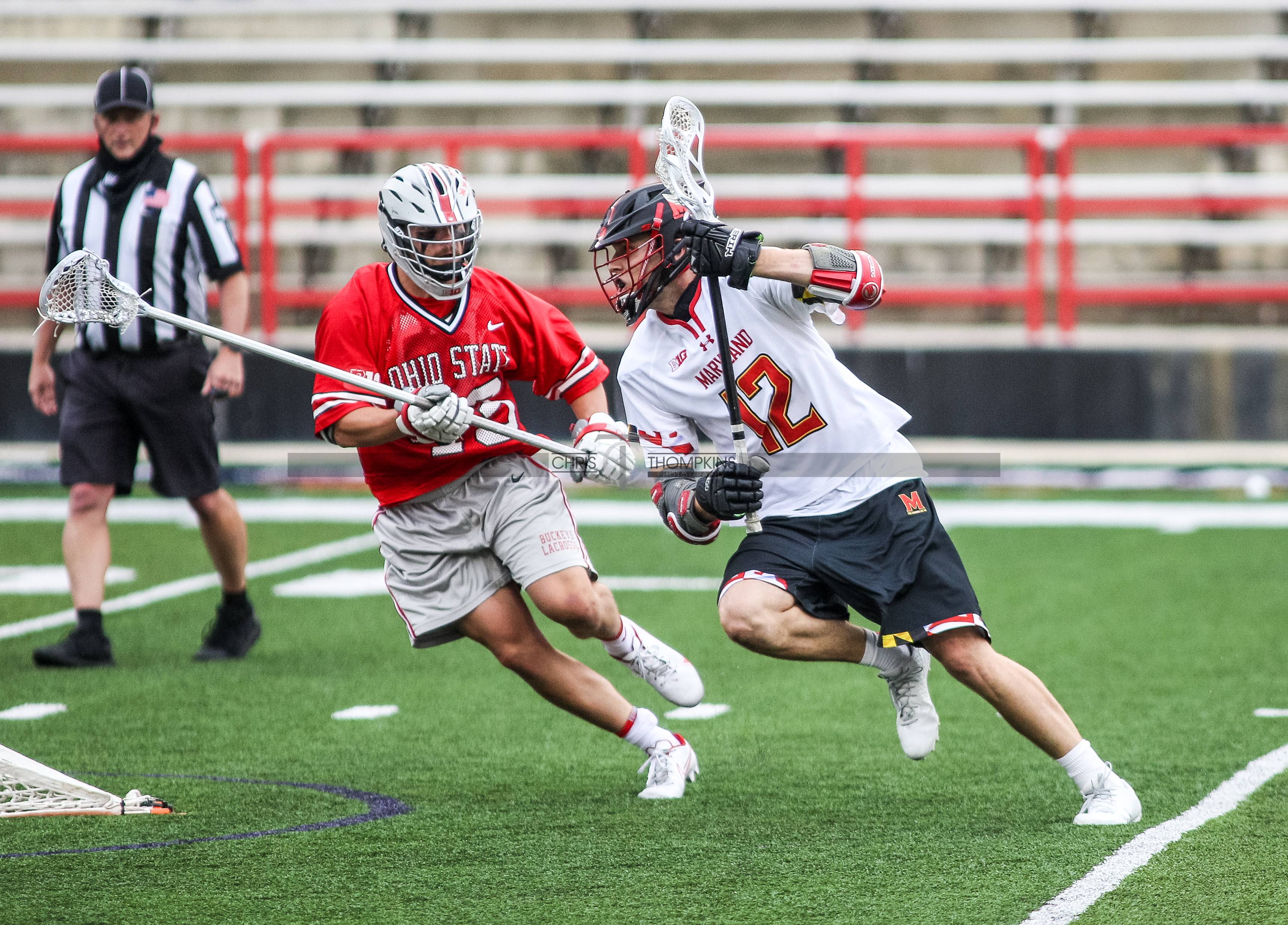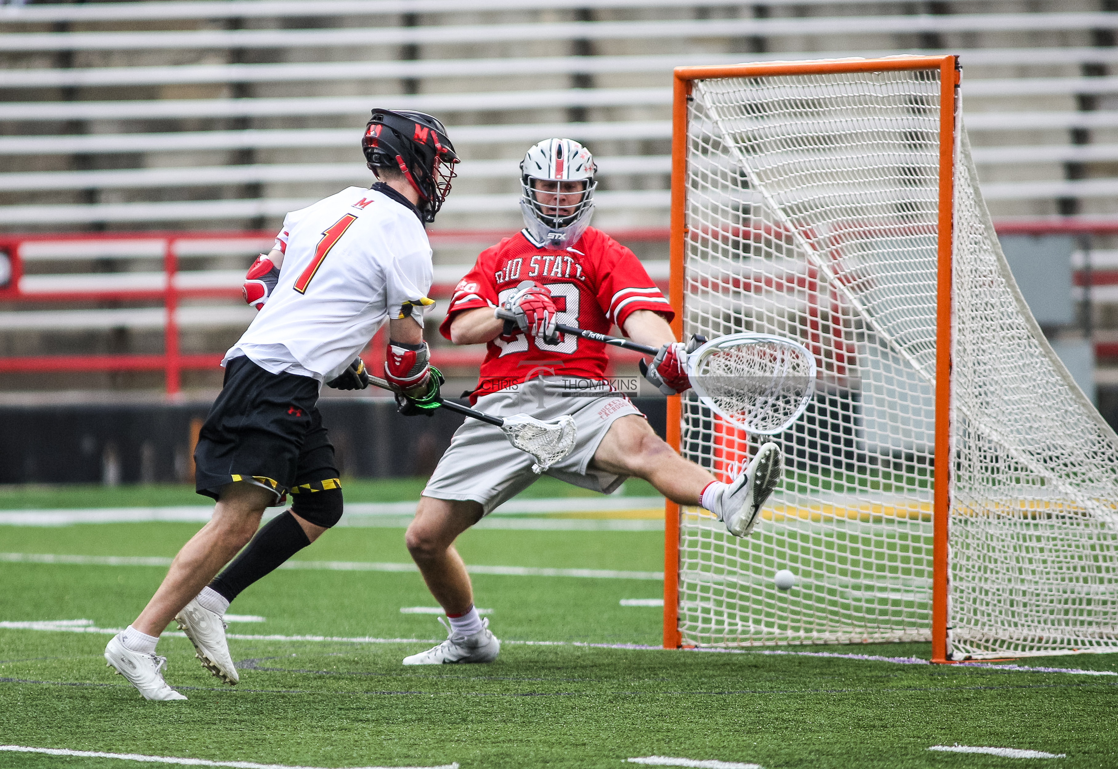 - April 18, 2021: Big Ten lacrosse action between Ohio State Buckeyes and Maryland Terrapins in College Park, Maryland. Photographer: Chris Thompkins (Credit Image: Chris Thompkins/dcsportsfan)