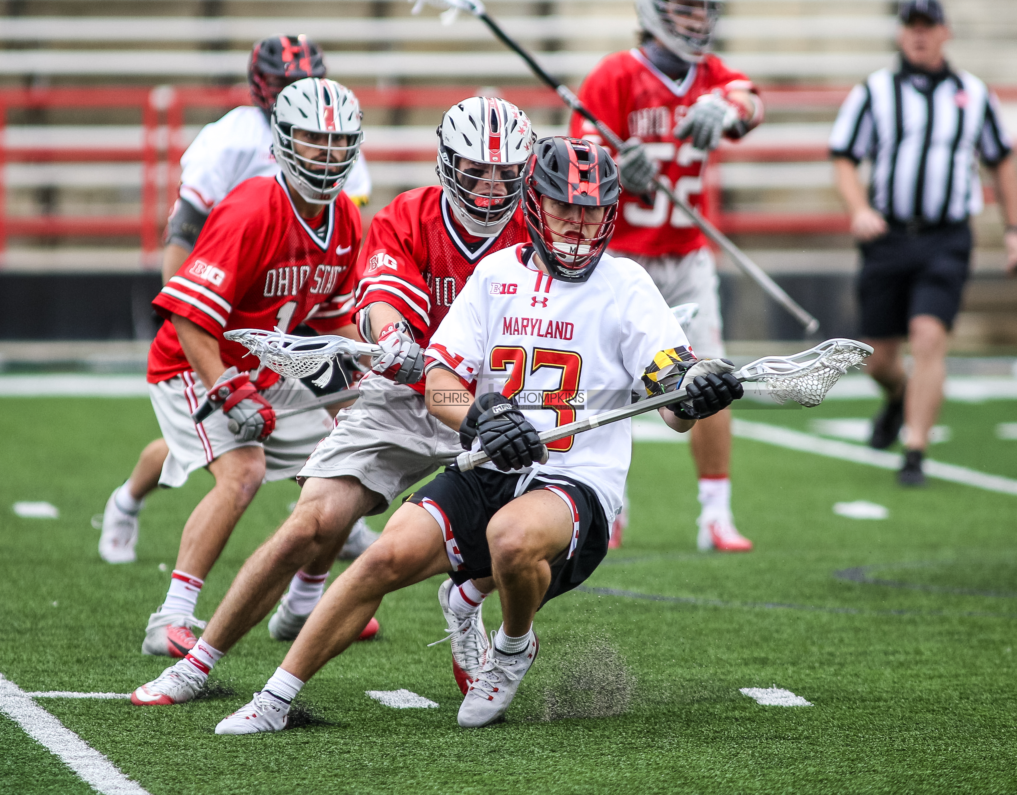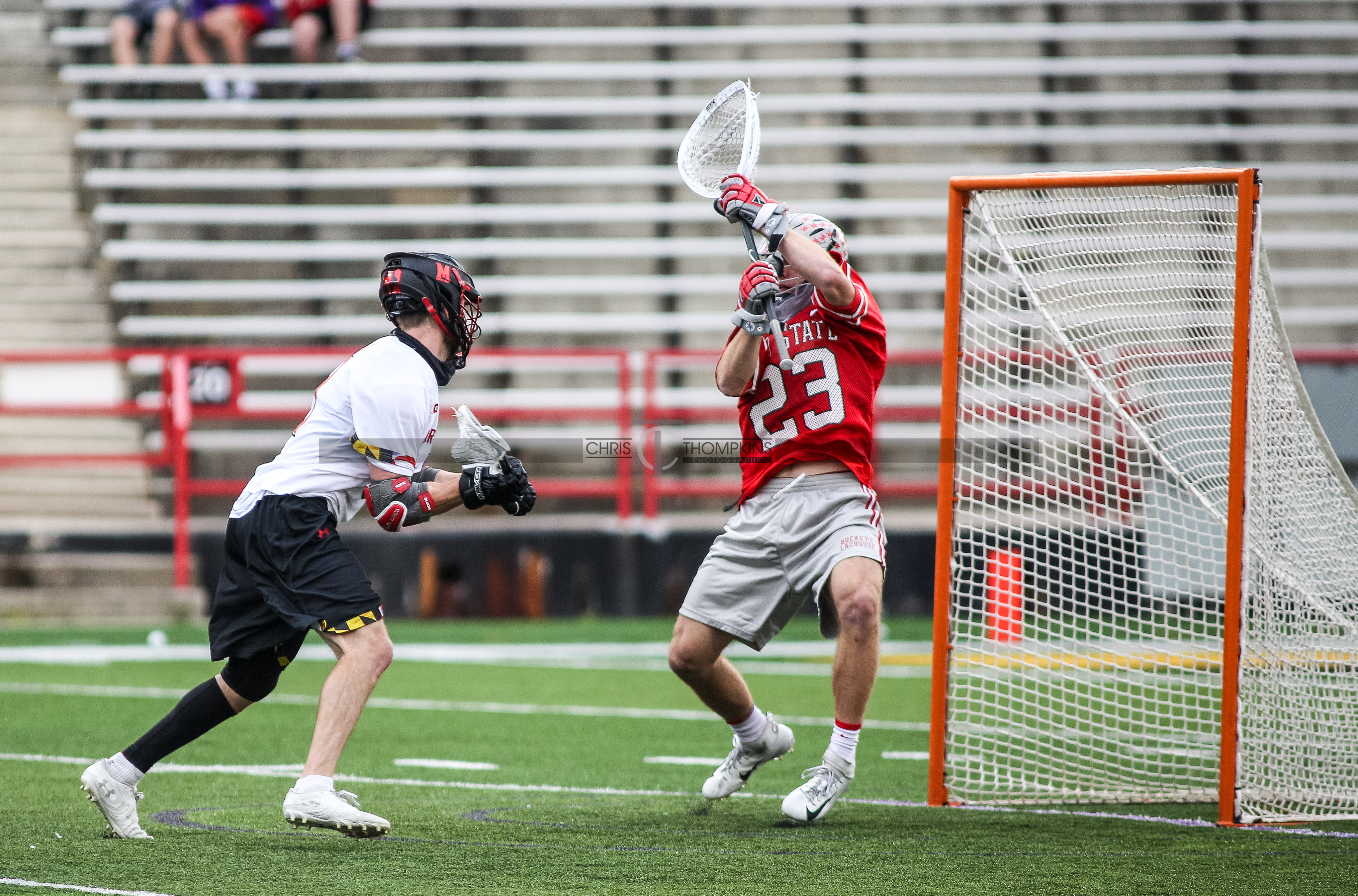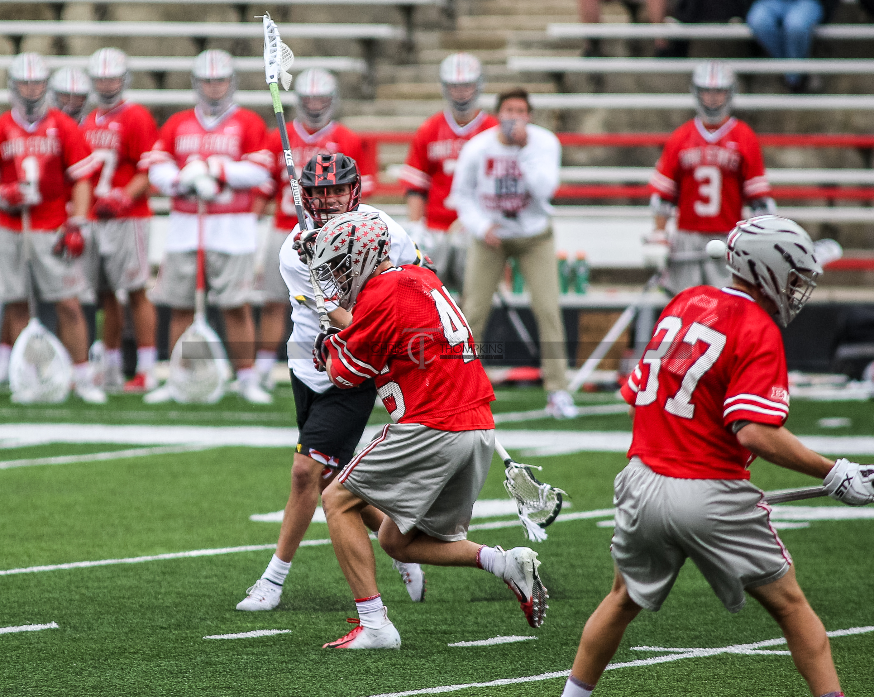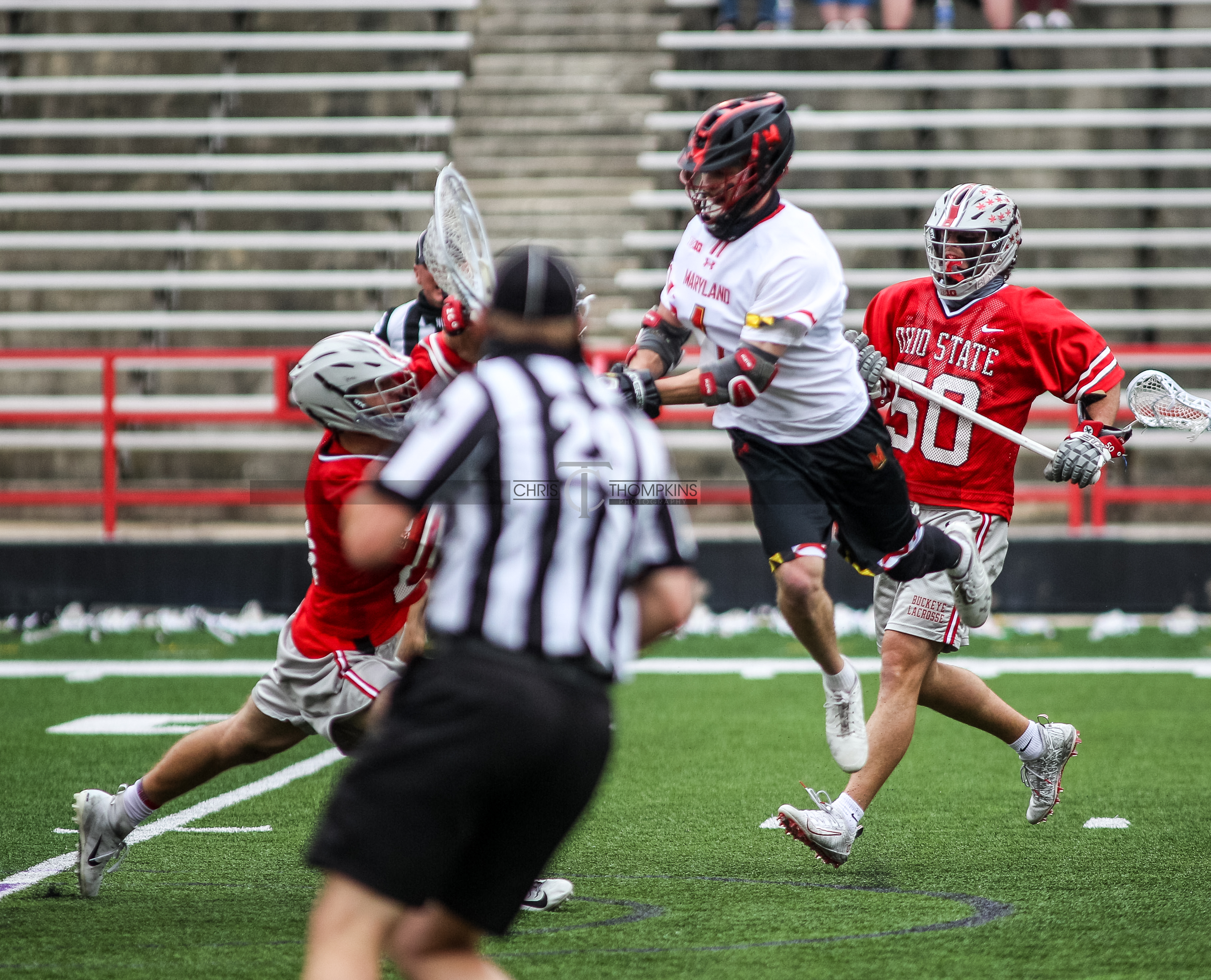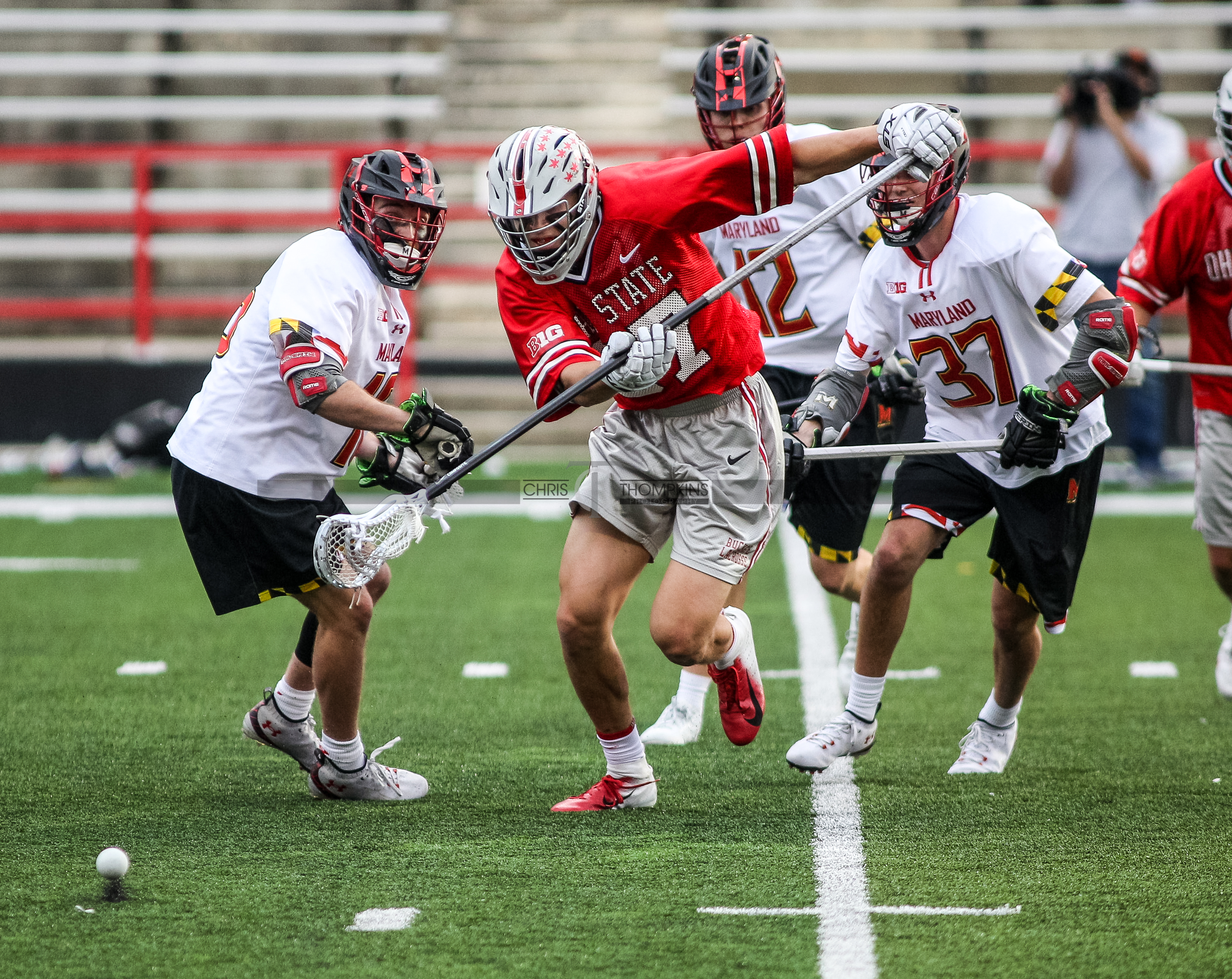 - April 18, 2021: Big Ten lacrosse action between Ohio State Buckeyes and Maryland Terrapins in College Park, Maryland. Photographer: Chris Thompkins (Credit Image: Chris Thompkins/dcsportsfan)