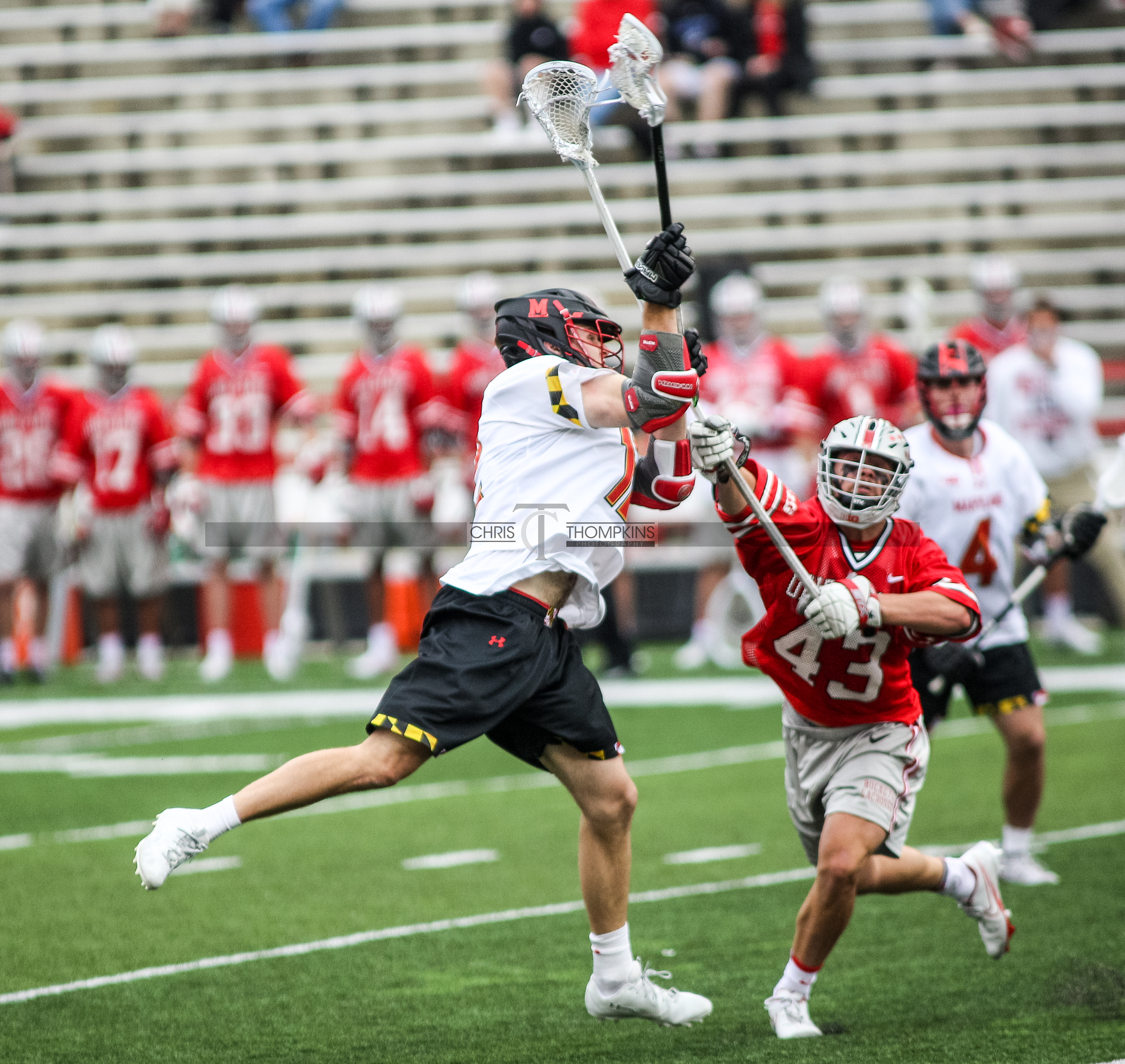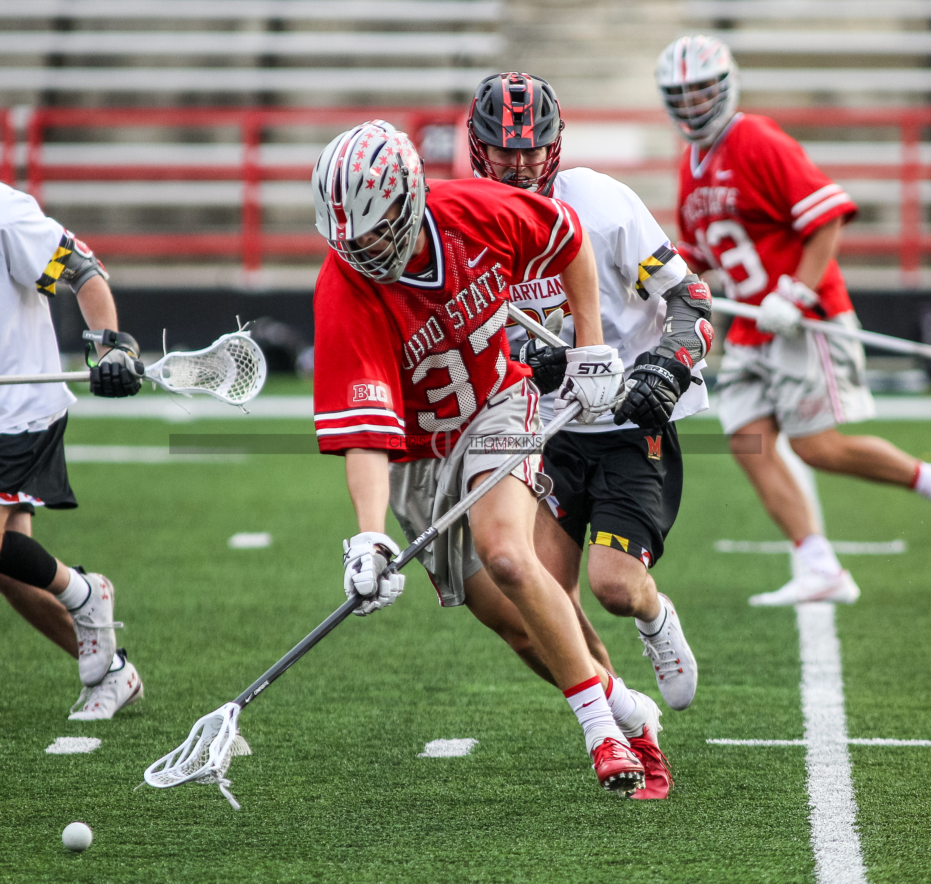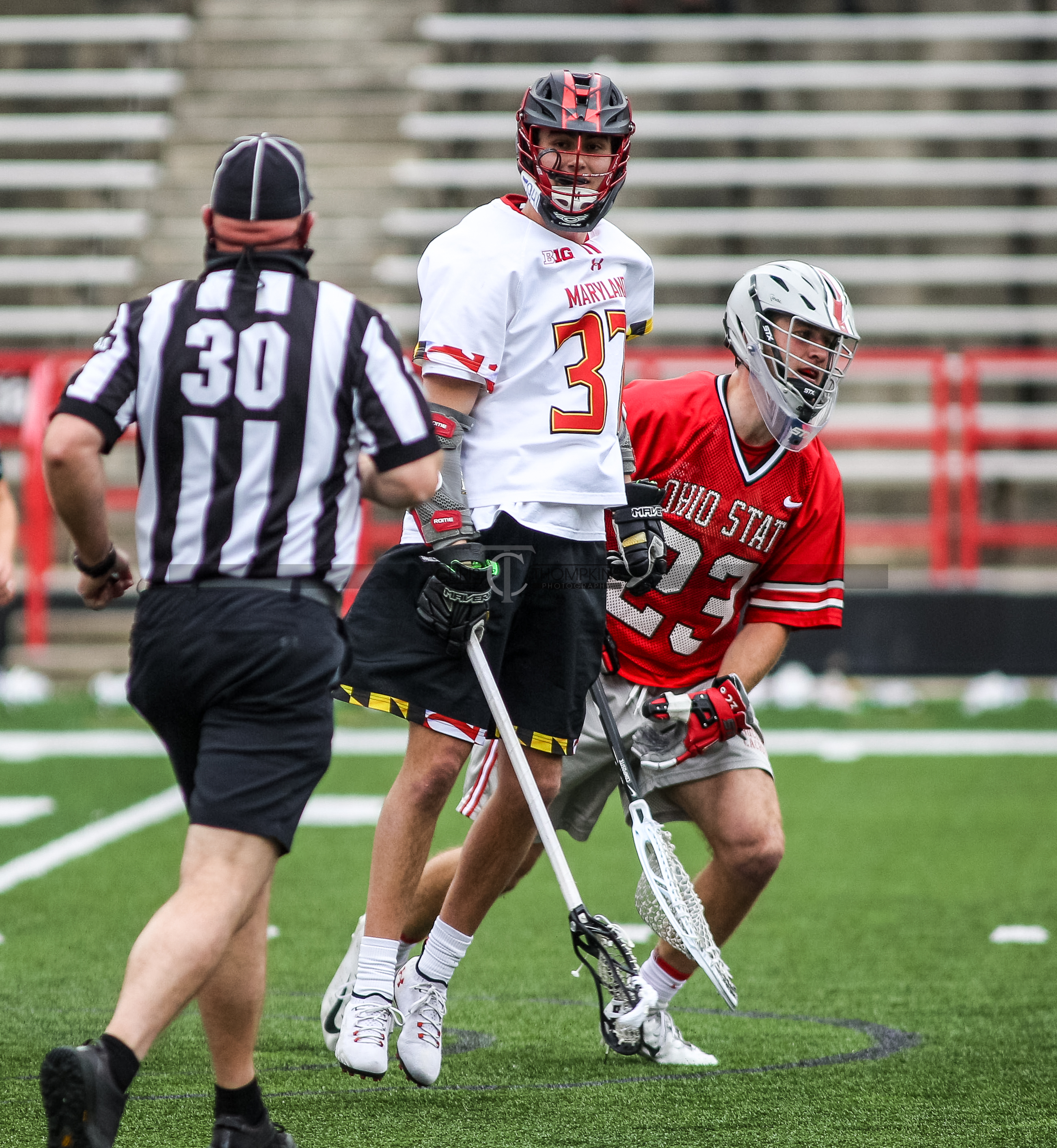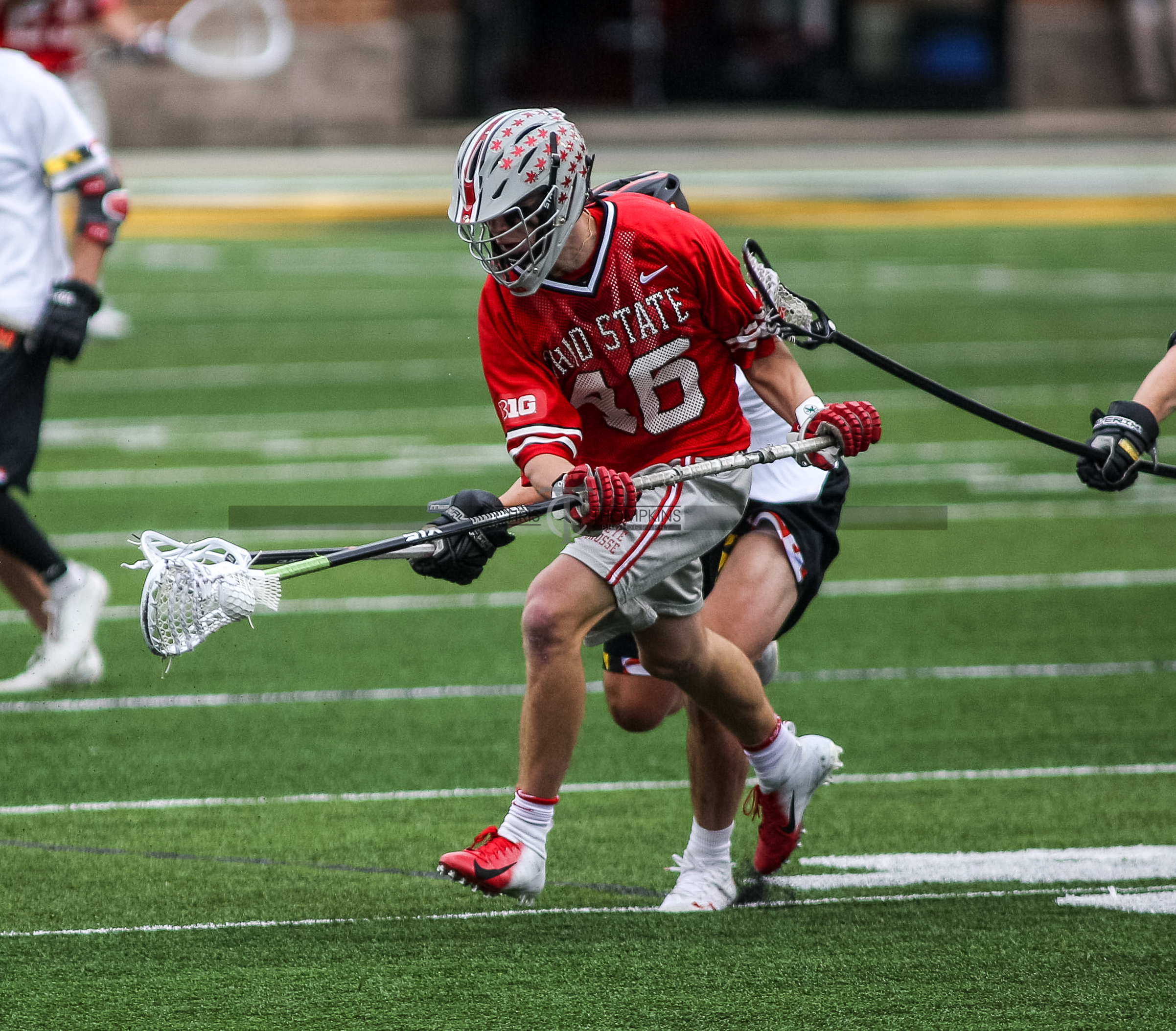 - April 18, 2021: Big Ten lacrosse action between Ohio State Buckeyes and Maryland Terrapins in College Park, Maryland. Photographer: Chris Thompkins (Credit Image: Chris Thompkins/dcsportsfan)