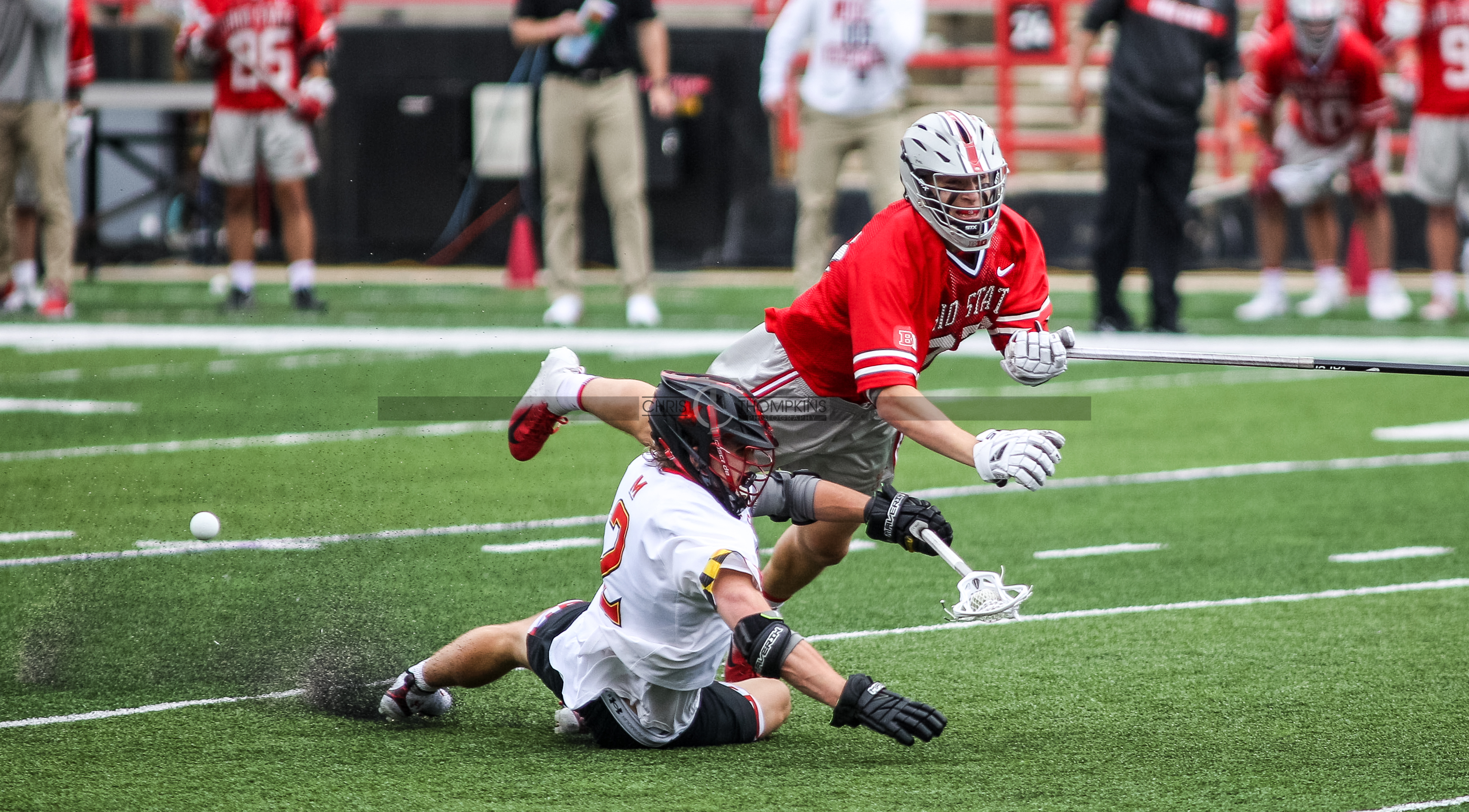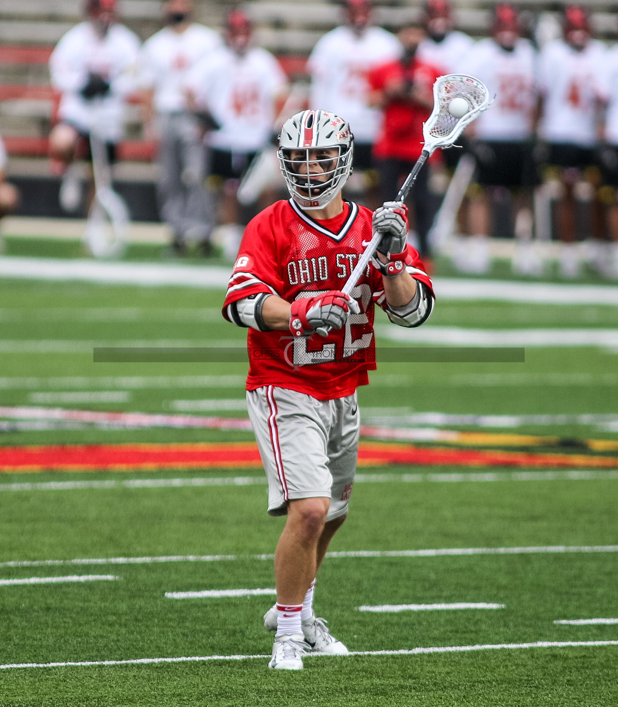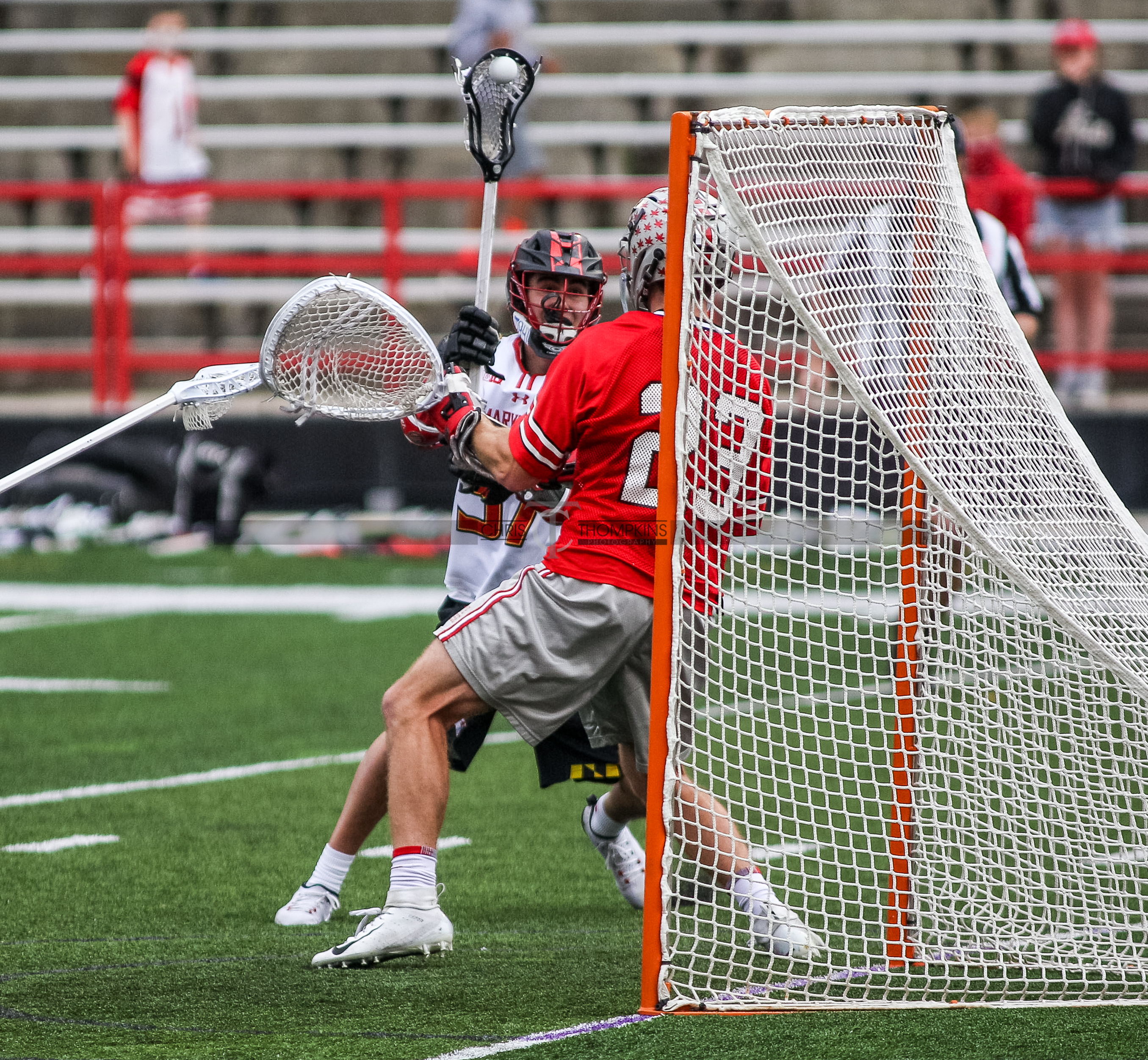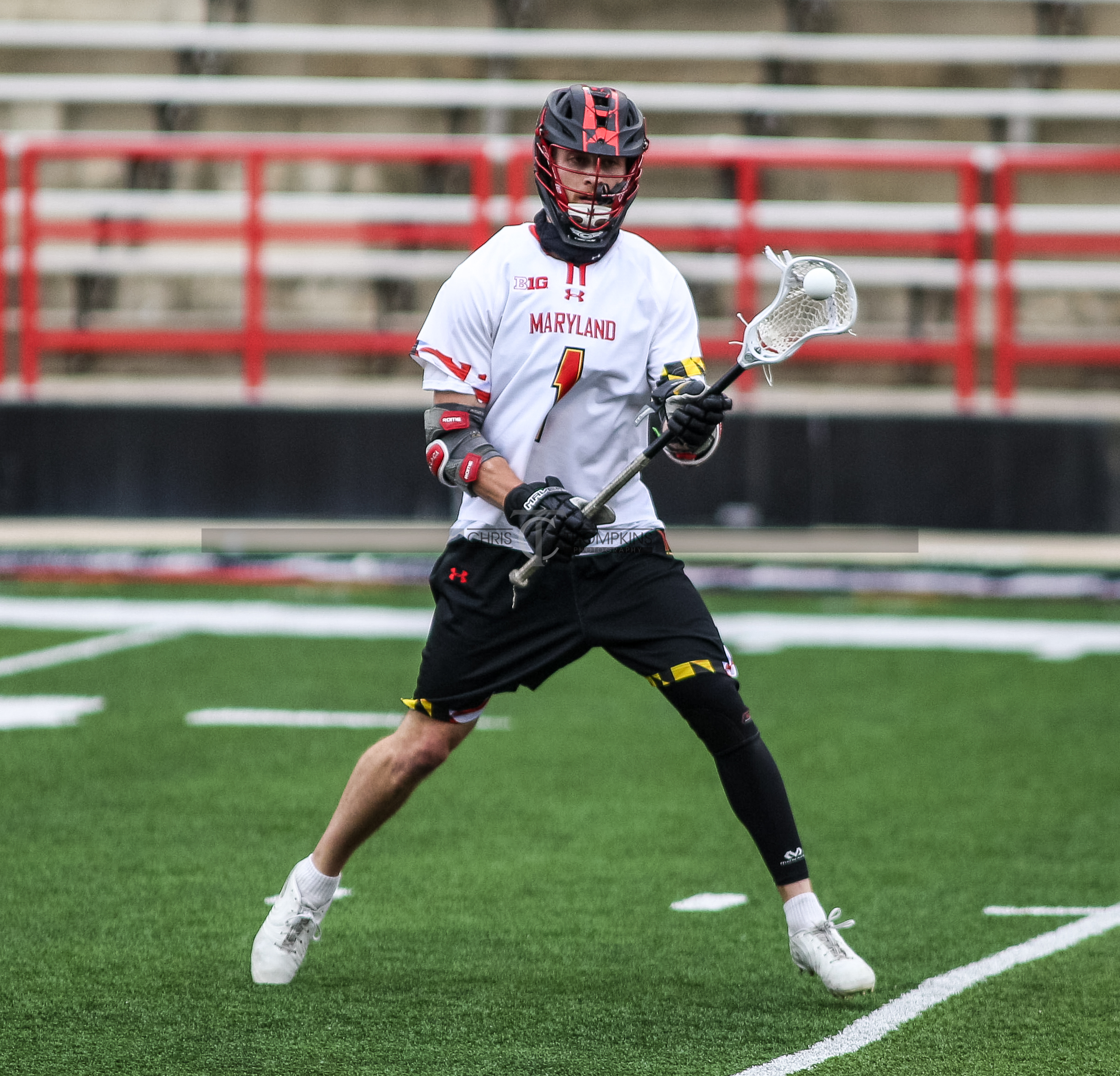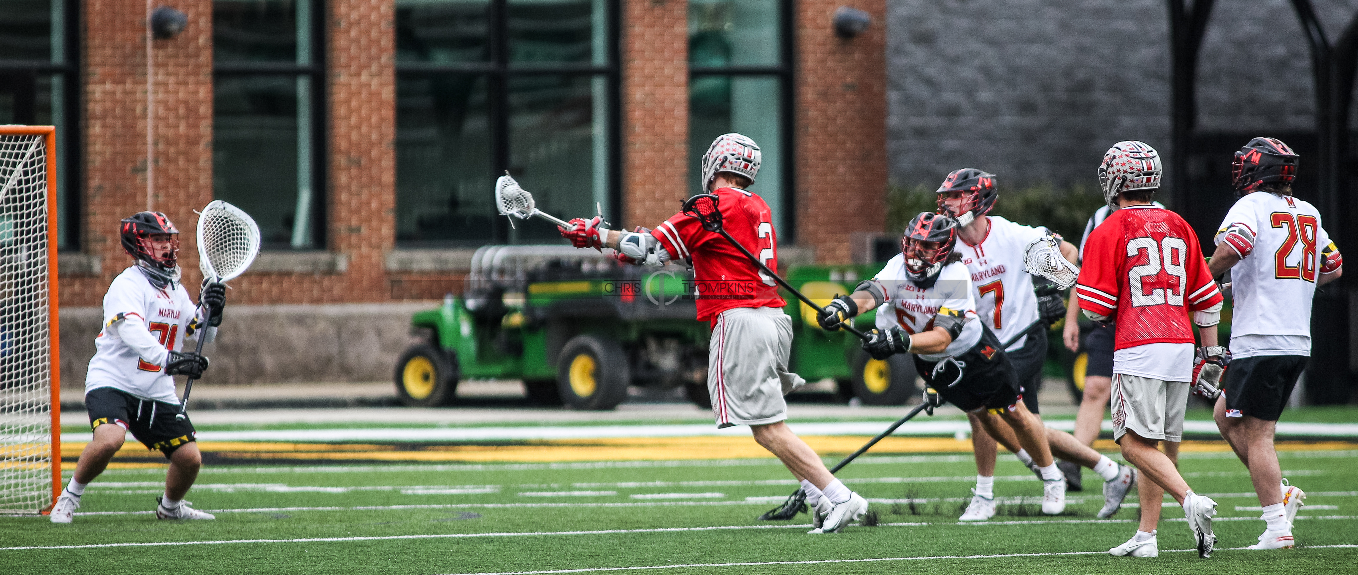 - April 18, 2021: Big Ten lacrosse action between Ohio State Buckeyes and Maryland Terrapins in College Park, Maryland. Photographer: Chris Thompkins (Credit Image: Chris Thompkins/dcsportsfan)