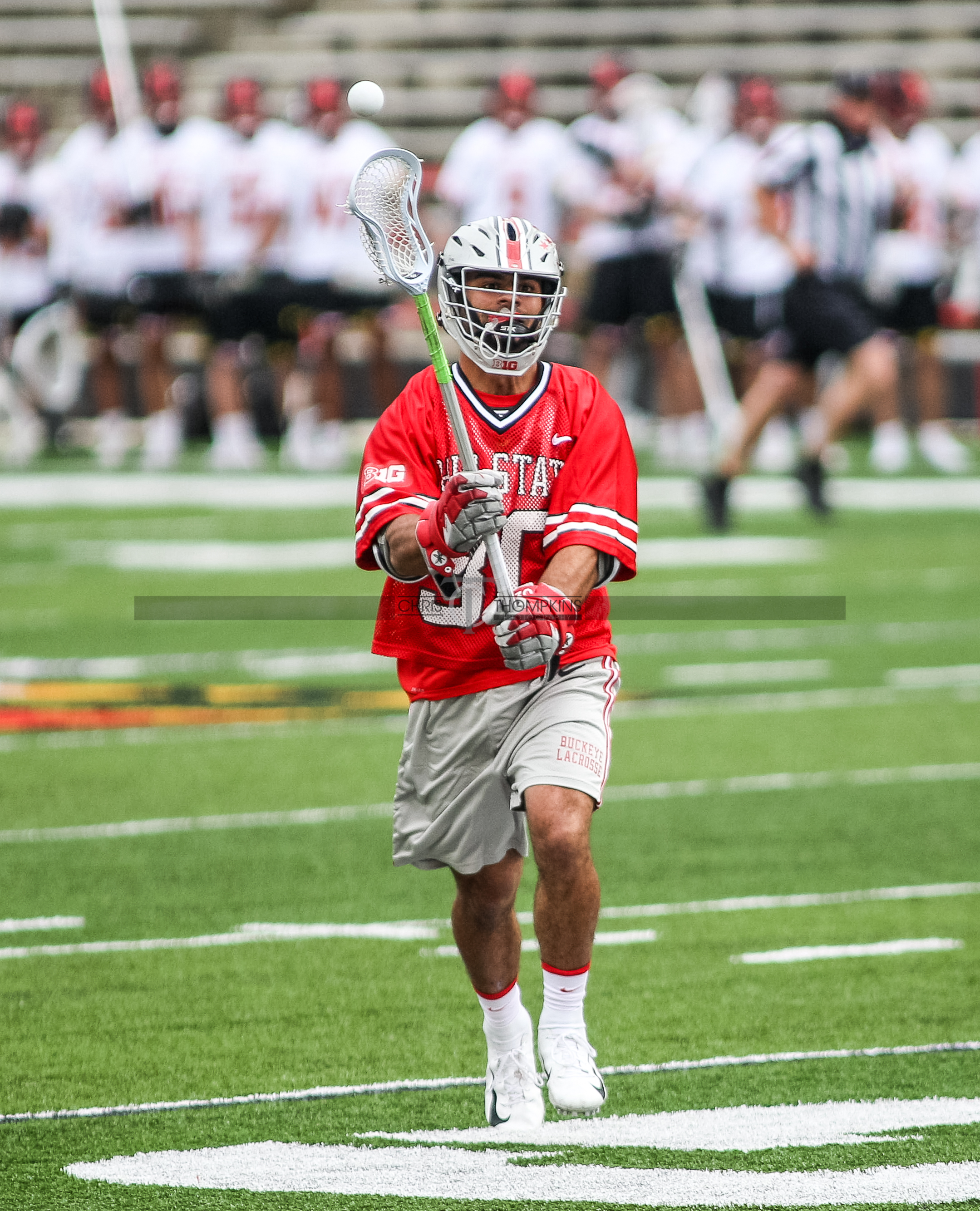 - April 18, 2021: Big Ten lacrosse action between Ohio State Buckeyes and Maryland Terrapins in College Park, Maryland. Photographer: Chris Thompkins (Credit Image: Chris Thompkins/dcsportsfan)
